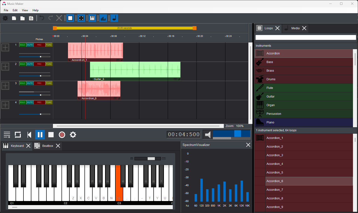 Music Maker is a music making program. The output is a WAV file. The software is built on music loops. You can try it for 7 days, if you like the application, you can buy it. It costs 9.90 euros.