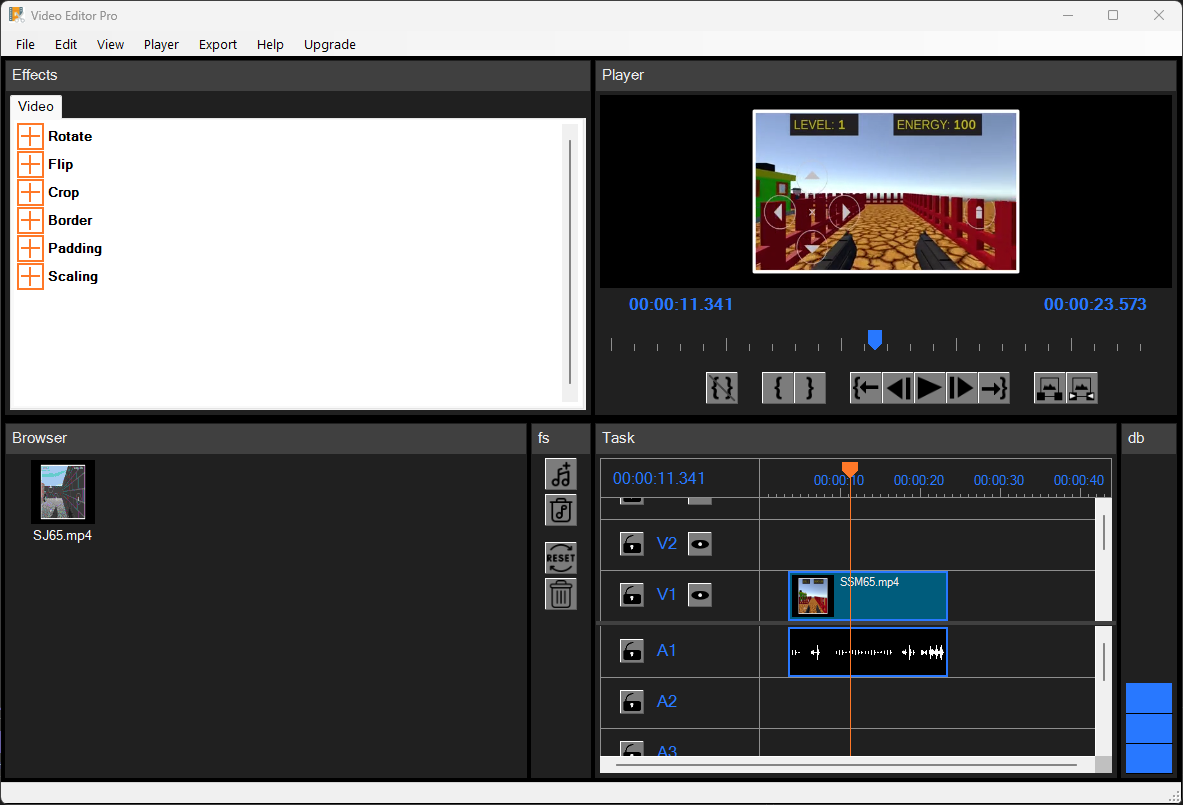 Video Editor is a video editing program. You can edit the video, add audio to it or remove audio. The program is simple and user-friendly. You can try it for 7 days, if you like the application, you can buy it. It costs 9.90 euros.